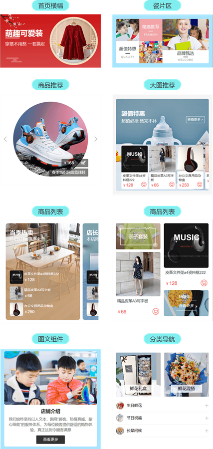 除了模板,组件也很重要,因为预设模板不能做到完全符合商家需求。此时商家可以通过更换、新增、删除模板预设组件的方式进一步装修店铺。为了满足不同场景的需求,系统除了提供各种功能不同的组件外,每个组件还预设很多样式,并且这些样式还支持自定义组件颜色。